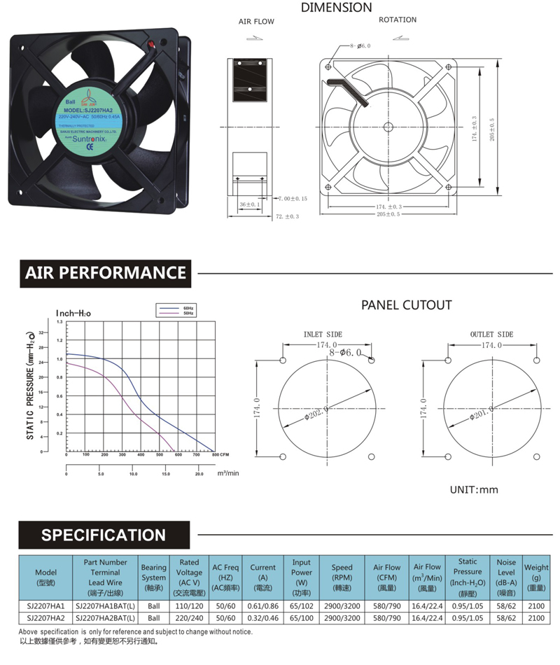 尺寸:205x205x72mm 框架:鋁ADC-12 軸承:含油軸承& 雙滾珠軸承 電壓:AC 110V 220V 380V 壽命:60 000Hours at 20℃--滾珠軸承 30 000Hours at 20℃--含油軸承 工作溫度:-20℃~85℃ 正常濕度 儲存溫度:-30℃~140℃ 正常濕度